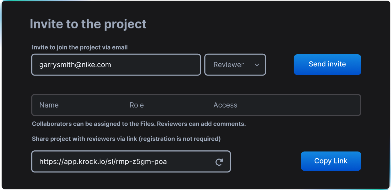 Share your work with anyone, whether they have a Krock.io account or not. Invite people outside your Workspace to join projects. Share steps with your team members. Or send a link with the viewer’s access to people who don’t have a Krock.io subscription yet.